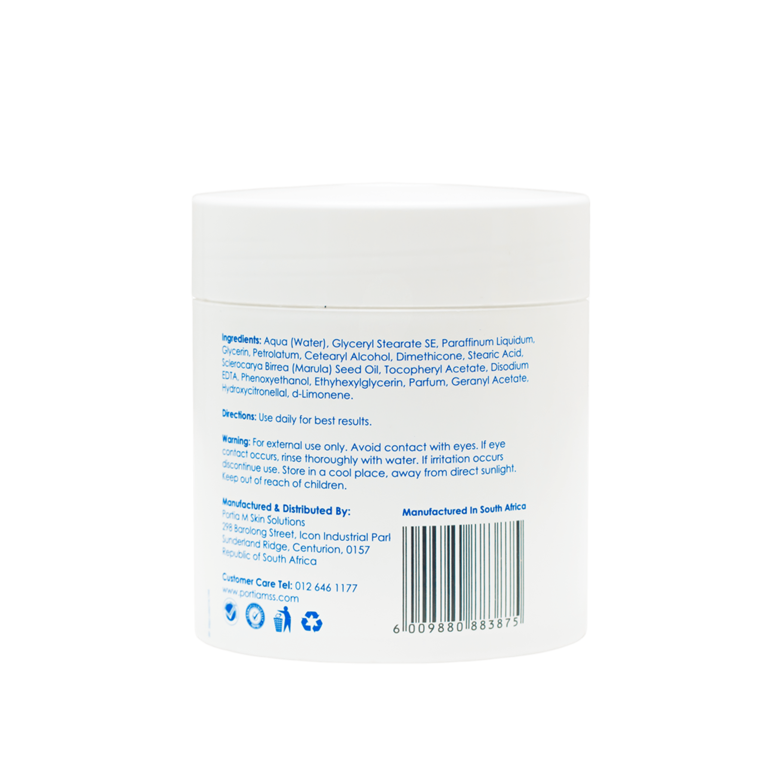 Water, Cetyl Stearyl Alcohol (and) Polysorbate 60, Paraffinum Liquidum, Glycerine, Stearic Acid, Petrolatum, Cetearyl Alcohol, Dimethicone, Sclerocarya Birrea (Marula), Oil, Parfum, Phenylpropanol (and) Ethylhexylglycerin.