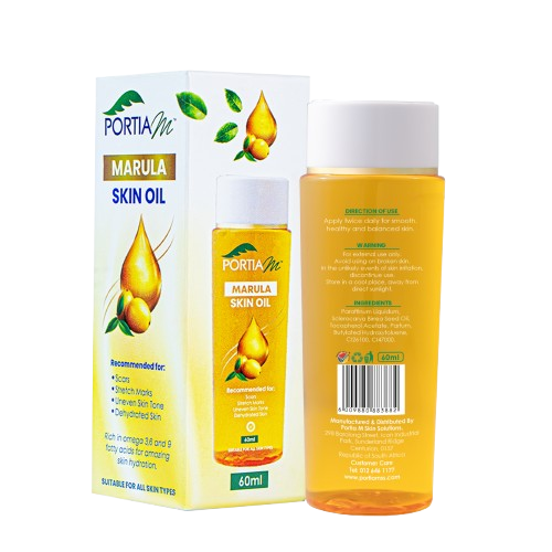 60 ml. Proudly South African®. www.portiamss.com. Customer care: 076 186 7282. Marula skin oil is rich in omega 3, 6 and 9 fatty acids that help rebuild skin cells. Dermatologically tested and approved at Medunsa Photobiology Laboratory through the SABS.
